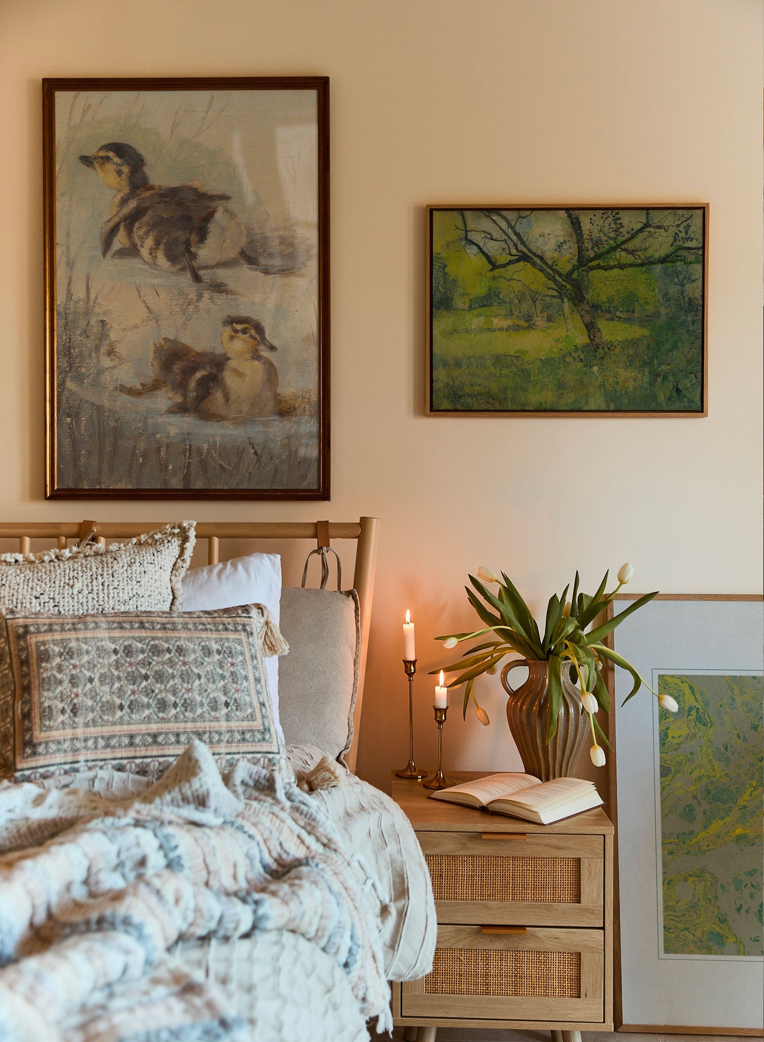Its muted palette of greens and yellows lends a calming presence to the scene. The brushstrokes bring depth and dimension, adding to the artwork’s immersive quality.