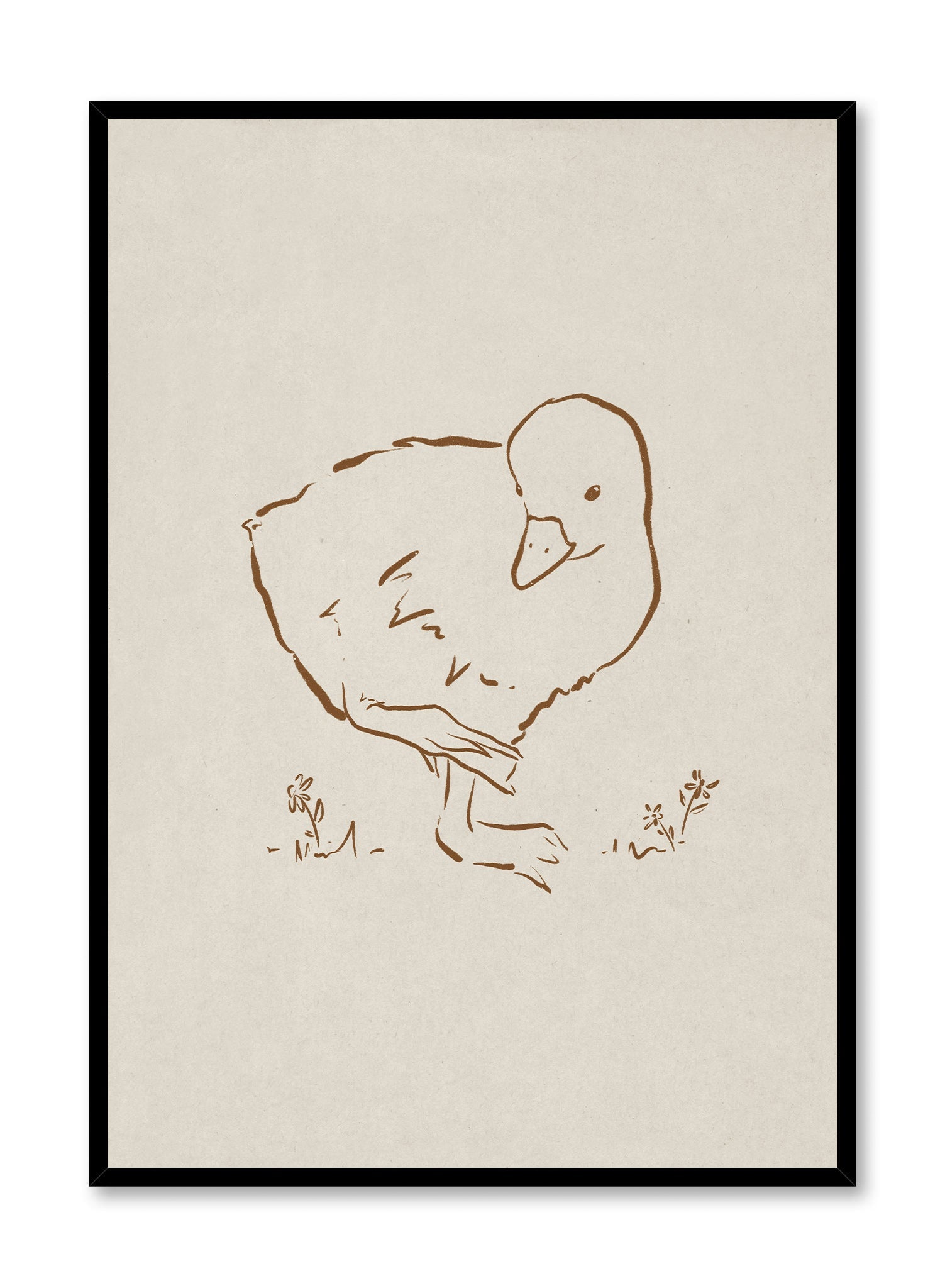 A charming duckling etched in warm sepia tones captures the simplicity of nature in this minimalist illustration. The delicate strokes highlight its soft features, while the muted beige background enhances the artwork’s quiet elegance.